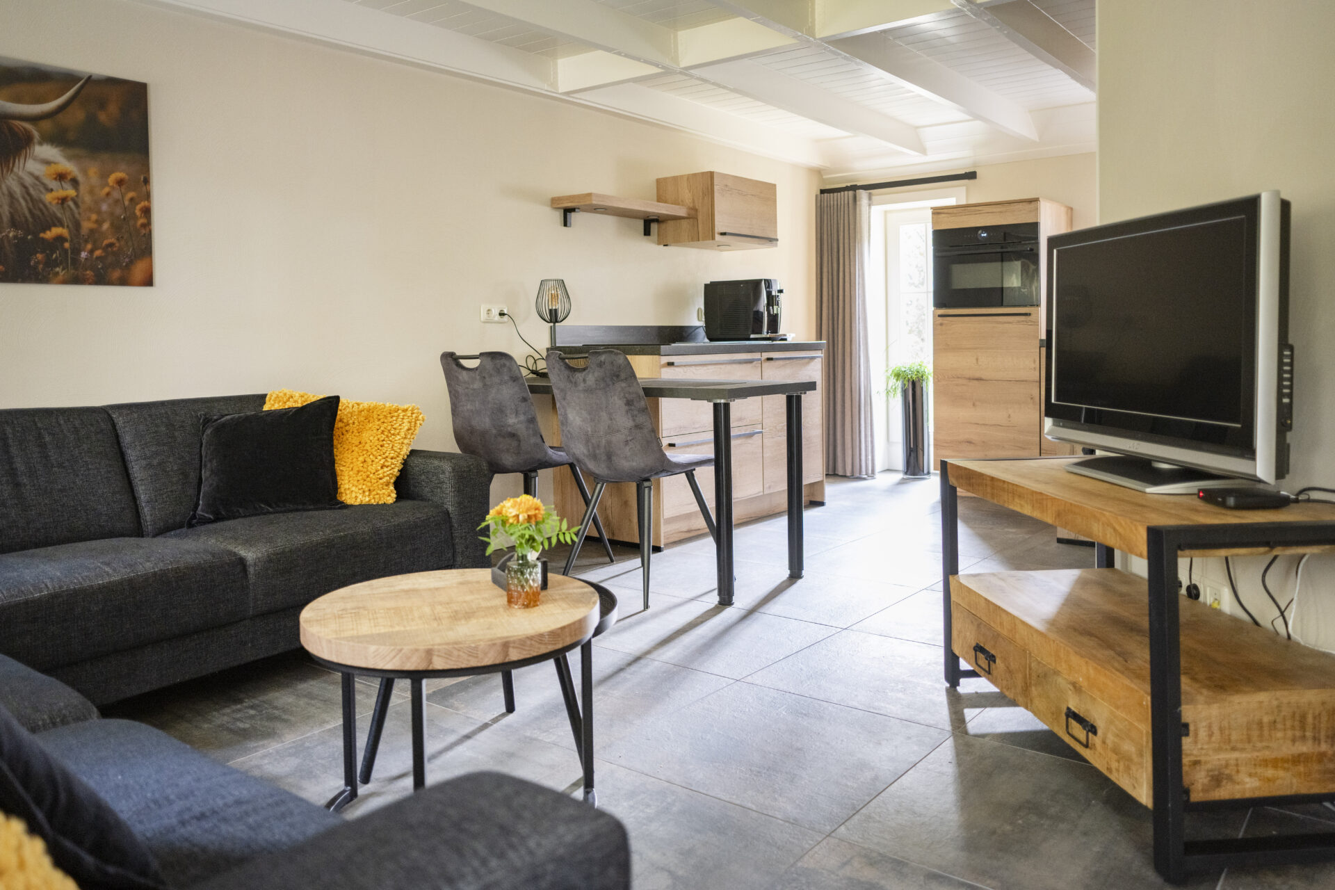 De woonkamer is ingericht met een comfortabele hoekbank en een tv, ideaal om te ontspannen na een dag in de Twentse natuur.