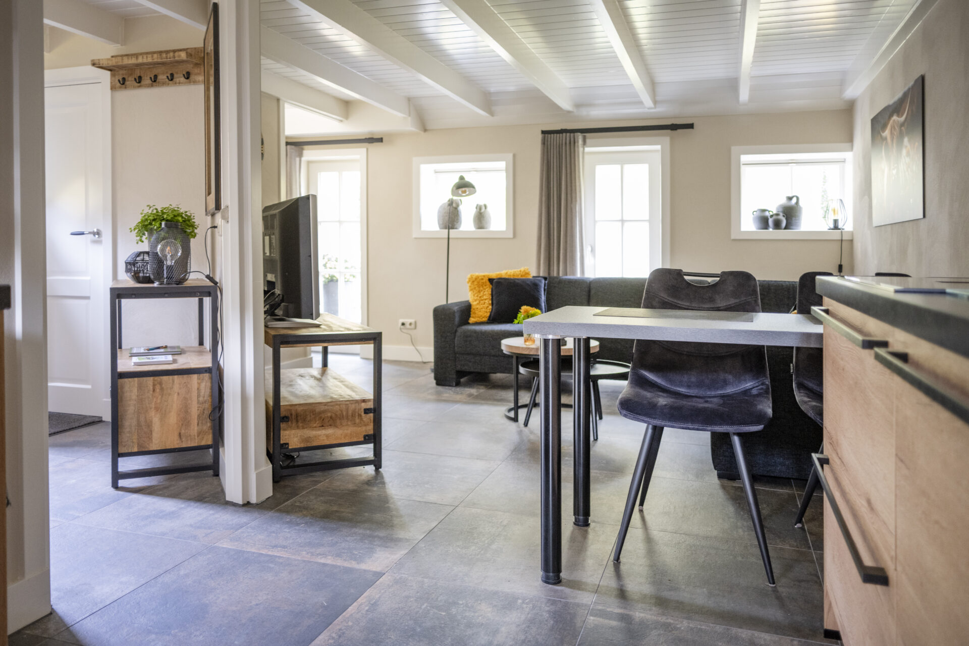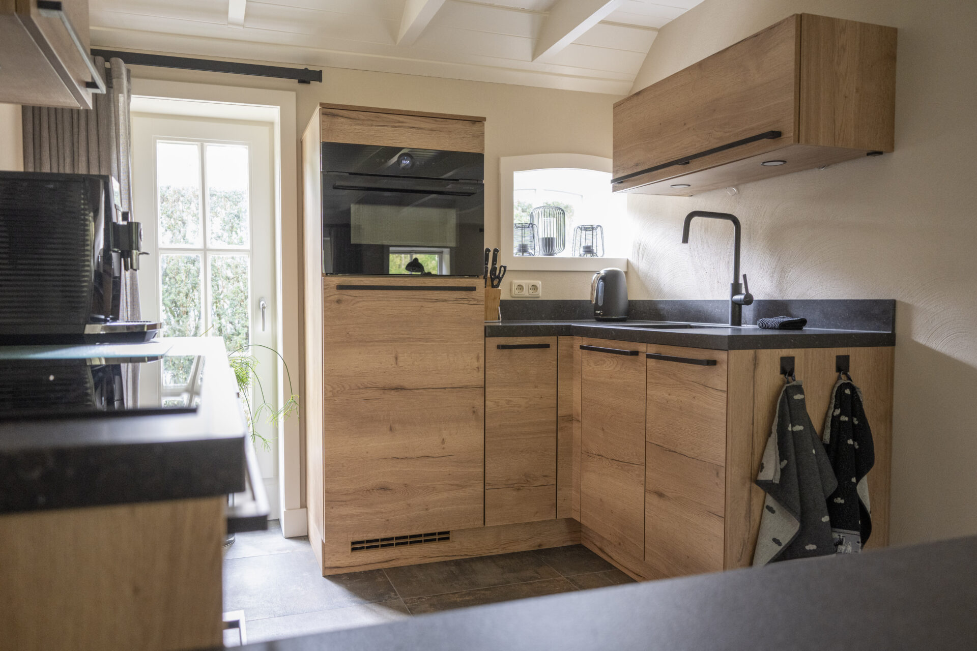 De open keuken is van alle gemakken voorzien: een vaatwasser, inductiekookplaat, combimagnetron, koelkast met vriesvak, compleet servies en bestek, een koffiemachine en waterkoker. De eettafel is geïntegreerd in het keukenblok, waardoor er een praktische en sfeervolle leefruimte ontstaat.